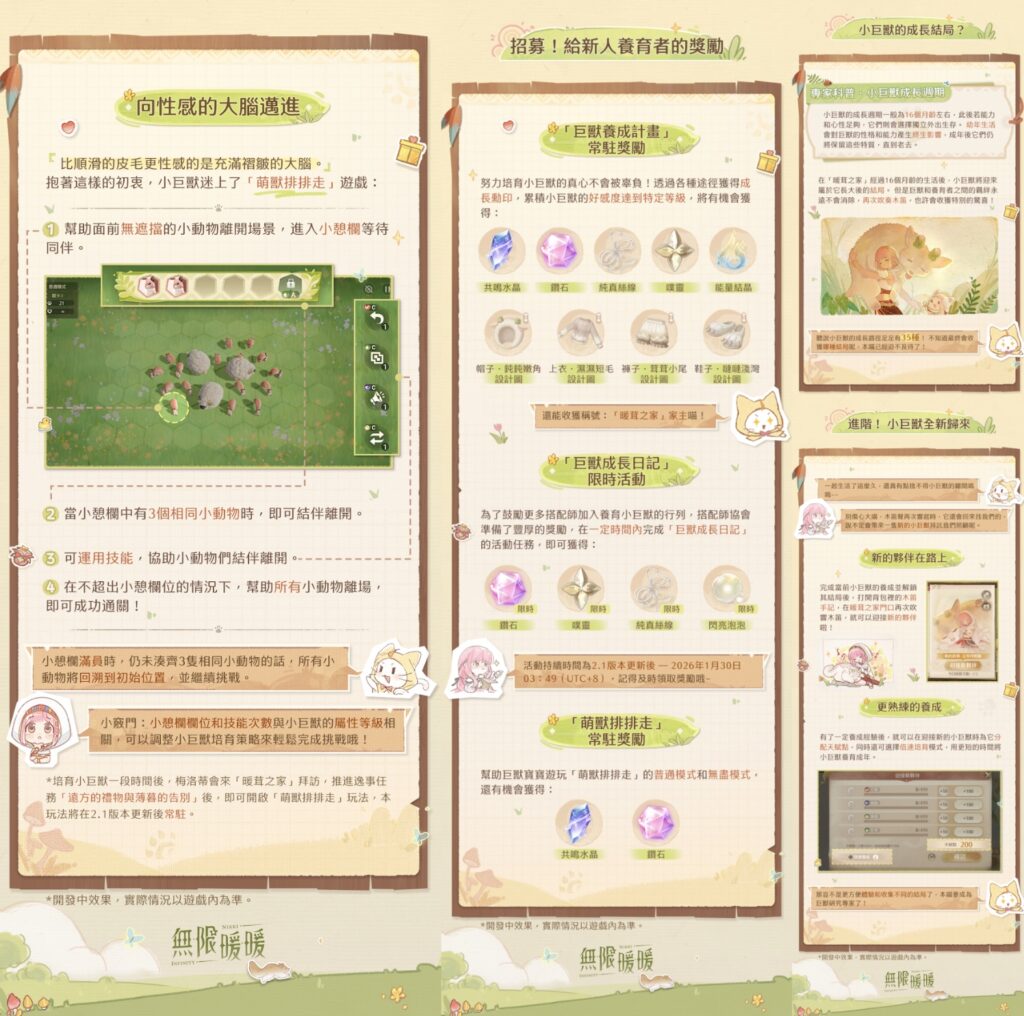 完成風物任務後,即可前往安眠之林北側的「暖茸之家」,體驗全新常駐養成玩法。搭配師可觀察小巨獸月齡與屬性成長,透過裝扮、餵食、摸頭等互動提升好感度,並在「成長里程碑」「茸茸心願」「林間逸事集」中領取【成長勳印】與各式獎勵。