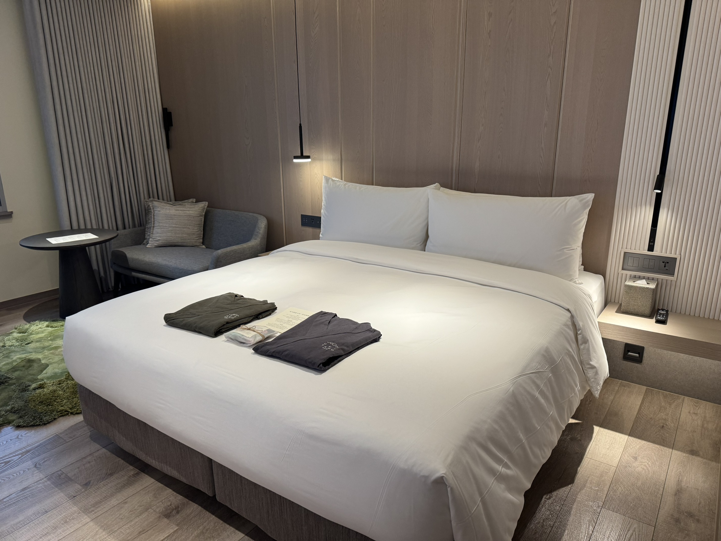 客房以低視覺噪音、溫潤木質與草地紋理地毯打造放鬆感受,並備台灣在地小農茶飲,讓「回房泡一壺茶」成為靜心儀式;房內影音系統提供呼吸練習、體位引導與克里亞瑜伽內容,旅人不必離房也能進行身心練習。另設「木守茶席 KIMAMORI」全預約制體驗,由茶師依當日天候選茶,每場限五位、90 分鐘在茶香中回到與自己對話的節奏。