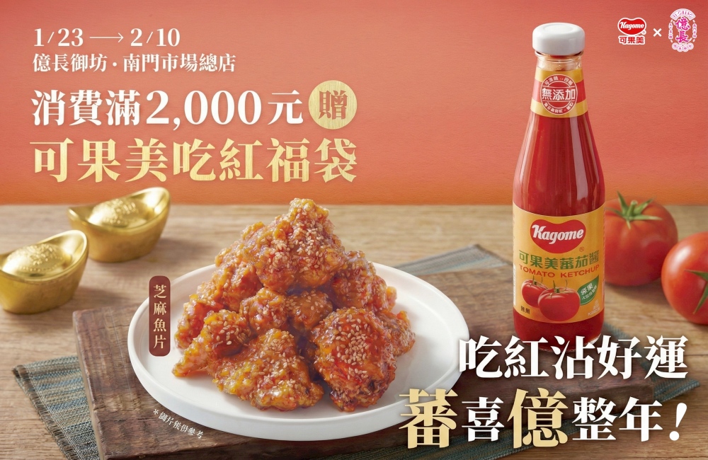 為迎接農曆新年,可果美蕃茄醬攜手南門市場老字號年菜品牌「億長御坊」,推出過年前限定的滿額贈活動,以「吃紅沾好運」活動,讓象徵喜氣的紅色不只出現在餐桌上,也成為年菜採購時的小驚喜。