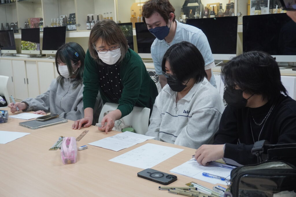 《圖說》金築順子老師(左二)指導學員四格漫畫手繪技巧。