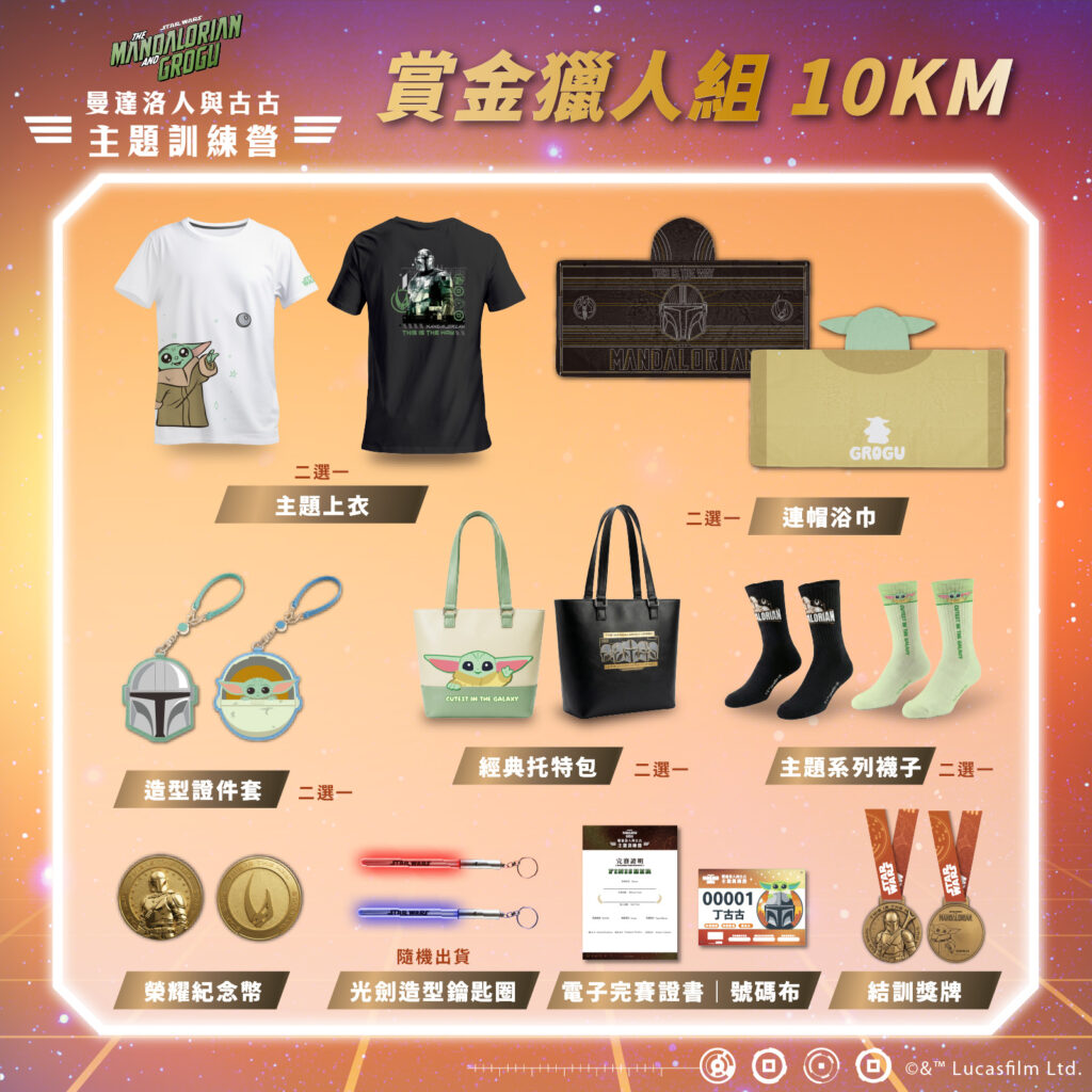 全統運動指出,「3.5K新進學徒組」與「10K賞金獵人組」皆採全程晶片計時,成績即時上傳。10K組別特別設有總排名獎金,凡獲得男女組前5名之選手,除獎金外,另可再獲得一座「曼達洛人與古古」主題特製規格獎盃。獎盃以「我輩之道」為核心精神,透過透光壓克力呈現曼達洛人與古古主題形象,搭配溫潤木質底座,展現獨特的光影層次與收藏質感。