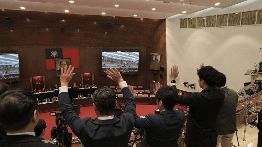 圖說:院會中立法院長韓國瑜以實況畫面歡迎島根縣議會議員到訪。