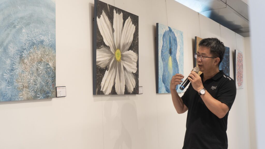 圖說:藝術家王明鐘喜愛觀察自然光影的變化,無論是山林的晨霧、海面的反光,或花朵在午後逐漸轉暗的色澤,這些轉瞬的片刻都像時間留下的痕跡。藝術家試著捕捉流逝的節奏,讓筆觸成為時間的語言。(圖/台北設計建材中心提供)