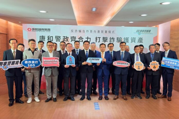 【民眾網編輯方笙楠臺北報導】刑事警察局持續號召民間企業加入反詐行列,推動「公私協力」共同打詐。本次由康和綜合證券(含康和期貨、康和投顧、康和保代)響應政府反詐政策,於114年7月22日與刑事警察局簽署防詐合作備忘錄(MOU),由刑事警察局副局長邱紹洲偕同識詐宣導專責團隊、洗錢防制及科技防詐等單位代表,與康和證券董事長鄭大宇共同出席簽署儀式。