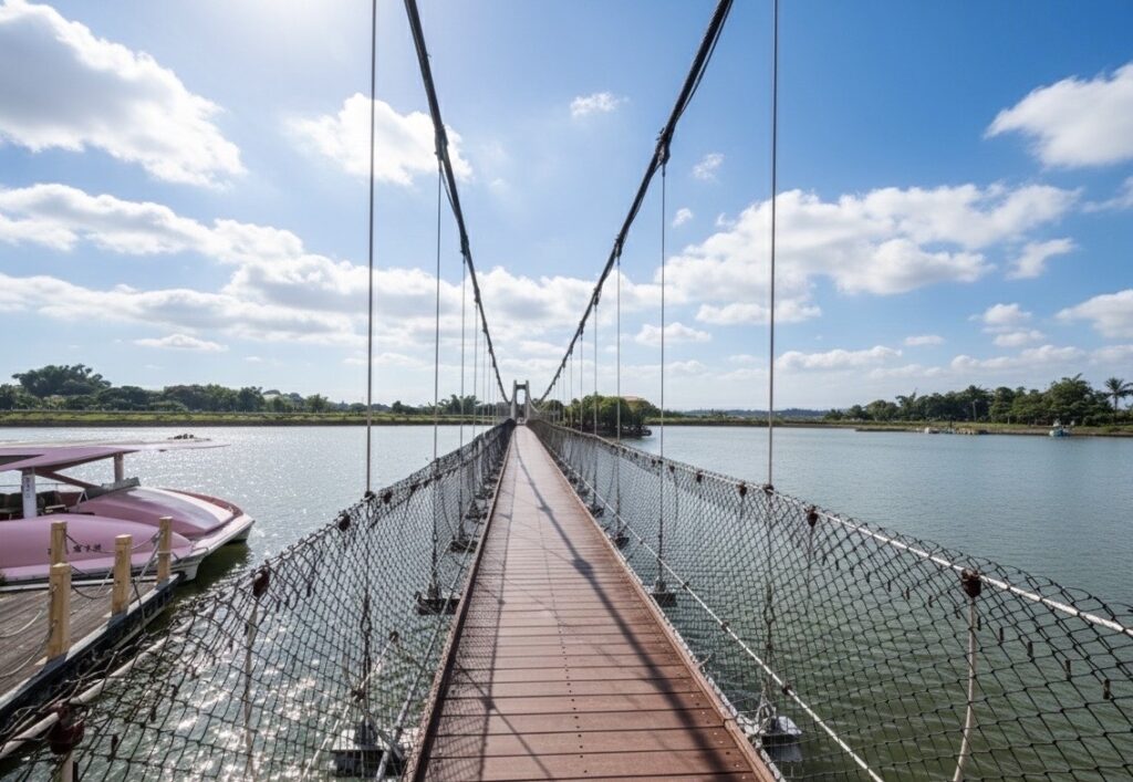 園區內的「虎月吊橋」建於明治38年,是到訪虎頭埤必走景點。吊橋夜間點亮LED燈光,倒映在碧綠湖面上,增添浪漫氣息,也成為旅客拍照熱點。