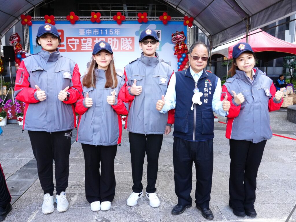 市長盧秀燕在民政局長吳世瑋及警察局長吳敬田等人的陪同下校閱各里隊代表,感謝所有守望相助隊的辛勞付出,讓市民家人能安心過年,並祝賀大家馬到成功、新年快樂、國泰民安。