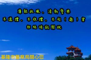 【民眾網編輯方笙楠基隆報導】基隆市警察局第四分局為貫徹公務員廉政倫理規範要求,革除不當受贈財物、飲宴應酬、請託關說等陋習,端正警察風紀,樹立廉能政風,以建構優質公務環境,提升警察良好形象,於春節前執行監察防貪專案工作。