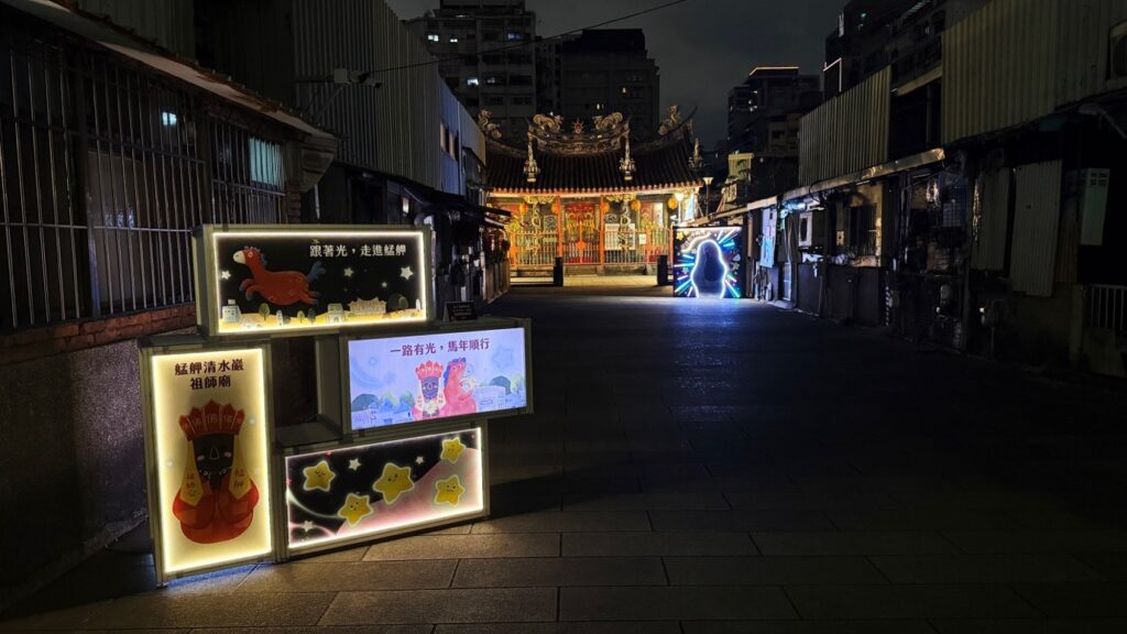 本次活動攜手剝皮寮歷史街區與艋舺清水巖祖師廟兩大在地文化節點,打造兩處特色燈景空間。位於剝皮寮歷史街區的「光行小馬」,以馬年為主題設計節慶角色,呼應老街的歷史肌理與紅磚立面,讓燈景不只是夜晚限定,即使在白天漫步,也能感受到光的存在與節慶氛圍。燈飾設計結合拍照打卡動線,讓民眾在參觀歷史街區之餘,也能留下屬於自己的節慶影像。
