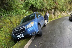 經了解,李姓男子與友人利用假日前往中橫沿線旅遊,行經該路段時因不熟悉山區道路狀況,右側車輪不慎滑落山溝,導致車輛受困,由於事發地點位處山區,周邊無其他人車可協助,情況一度相當無助,只好向警方求助。