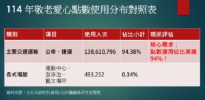 另針對掃碼搭車使用率極低問題,社會局回覆因「71處場館缺乏掃碼設備」導致推動困難,王欣儀現場拿出數據打臉。長輩敬老點數有 94% 都用在搭車,運動中心或藝文場館的使用率僅有0.3%,怒轟「九成以上的交通需求設備早就建置好了,社會局卻拿不到 1% 的場館設備沒到位來推託不開放乘車碼扣點,簡直是行政怠惰!」