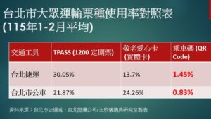 【民眾網編輯方笙楠臺北報導】臺北市議員王欣儀於民政部門質詢時指出,市府大力推動手機掃「乘車碼」搭車,結果因功能缺陷,竟然將佔運量最大宗的TPASS通勤族與使用敬老愛心卡民眾完全排除在外!導致目前乘車碼使用率低得離譜,公車僅 0.83%、捷運僅1.45%,成效極其慘澹!