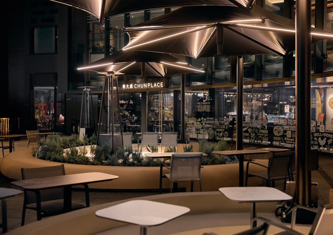 春大直戶外廣場有別於一般商業空間,以減法設計保留大量空間,寬敞的用餐區散落於廣場四周,如同一個個小型獨立區域,保留用餐舒適度,也確保與朋友小聚的最佳距離。中間的空地不只未來將規劃週末的音樂、活動演出,日常也能成為家長讓小孩、寵物奔跑的空間,於午後暖陽下,搭配精緻小食,讓時間慢下來。