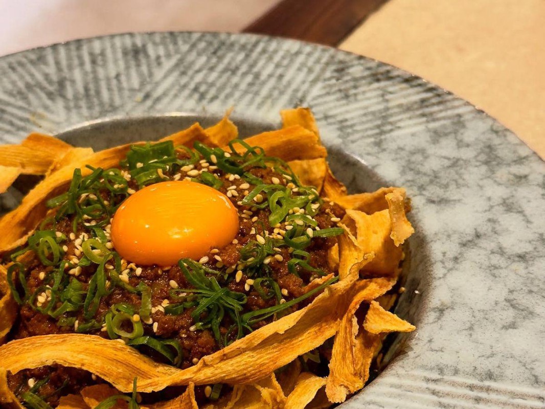 被譽為西區必吃咖哩的「月見乾咖哩」,是在台中日式咖哩市場中少見的乾咖哩(ドライカレー)作法,將絞肉與香料、蔬菜融合,收乾醬汁後,再搭配蛋黃與炸牛蒡絲,拌開後香氣四溢,口感濃而不膩。而炭燒咖哩則是結合了碳火與辛香料的香氣,在不同的風味種展現層次。