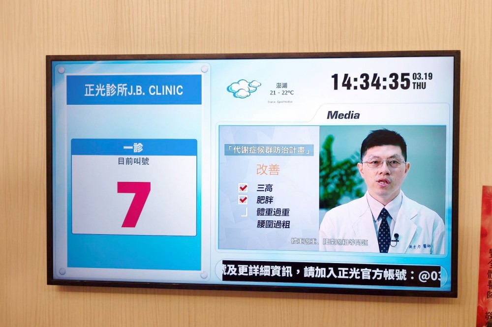 系統功能涵蓋多診間動態版面切換、低延遲叫號音訊與畫面同步、診所人員自主管理的衛教影片播放,以及延伸至院外的即時叫號顯示。操作介面直覺易用,醫護人員無需資訊背景即可上手。