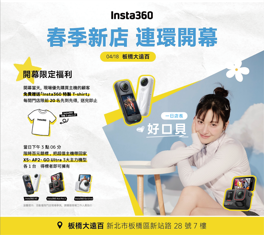 INSTA360專賣店 全新據點進駐板橋! 全景相機/運動相機最新機種現場體驗 搭配開幕好禮多重送,及相機競標活動 【2025年04月18日】 全球領先全景影像科技品牌 INSTA360,與其長期合作夥伴,台灣代理「東城國際」展開深度戰略合作,在新北【板橋大遠百7F】設立 INSTA360 旗艦專賣店。提供消費者精緻舒適 的體驗空間。店內展出各系列影像產品,包括各款全景數位相機、運動相機,及各式原廠周邊配件等,讓消費者可以輕鬆自在體驗攝影及輸出的樂趣,滿足一站式購物的多元需求。現場設有專屬實機體驗區,更提供 全球第一台360度全景空拍無人機,影翎A1實機體驗,並有專業服務人員帶領體驗拍攝流程,讓消費者親身感受 INSTA360 帶來的創新技術,提供最前線的沉浸式影像體驗。