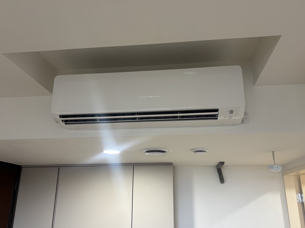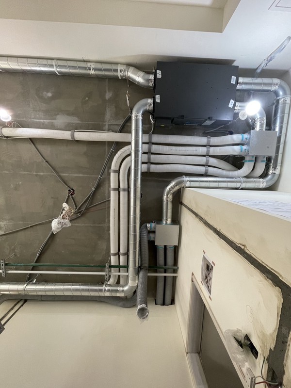 另一個位於土城「馥華A+」的新成屋案件,則顯示出現場條件與原始規劃之間常有落差。雖然建商已先預留外氣孔,但昇宏進場勘查後發現,天花內部原有管線配置複雜,若沿原路徑施作,將提高施工難度與干擾,且原規劃進氣處為建物內凹式廢氣聚集地,此環境不適合讓配置進氣口,因此改由後陽台重新配置外氣進排氣位置,那邊靠近路邊馬路有新鮮氧氣的供給不會造成不良效果,並同步整合冷氣與除濕系統需求。施工過程中,團隊也針對主臥出回風口與門片、系統櫃之間可能產生的衝突做出調整,讓設備配置更符合實際生活使用。