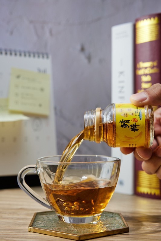 鯖粹精華液以溫水沖泡後呈現琥珀色澤,口感溫潤,展現日常保健飲用的便利性與質感。圖/拾粹院提供
